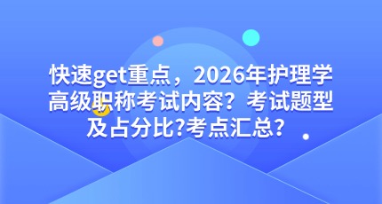 以上有关"快速get,2026年护理学高级职称考试内容?考试题型及占分比?考点汇总?”是由直达100小编整理编辑,各个地区卫生高级职称考试报名时间可关注直达100公众号或官网!需要备考资料可点击“在线咨询”联系客服免费领取!